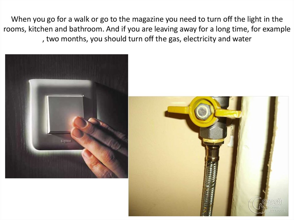 When you go for a walk or go to the magazine you need to turn off the light in therooms, kitchen and bathroom. And if you are leaving away for a long time, for example
