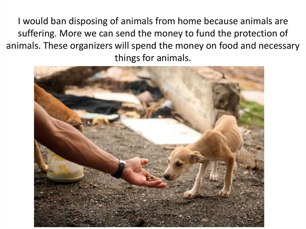 I would ban disposing of animals from home because animals aresuffering. More we can send the money to fund the protection of