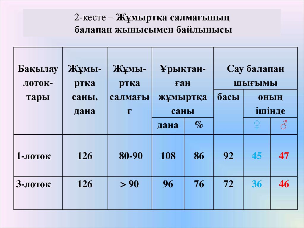 2-кесте – Жұмыртқа салмағыныңбалапан жынысымен байлынысы