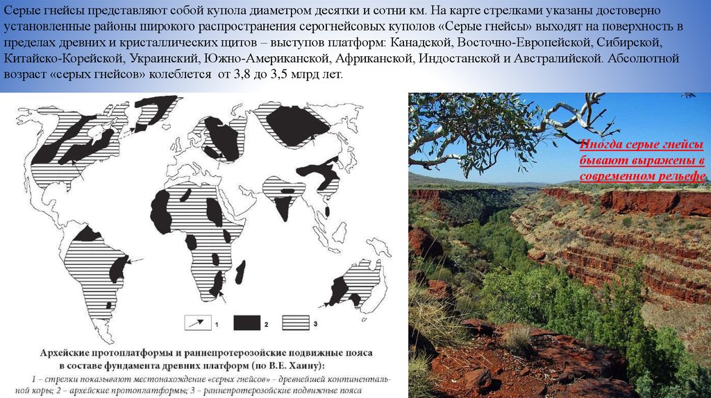 Серые гнейсы представляют собой купола диаметром десятки и сотни км. На карте стрелками указаны достоверноустановленные районы широкого распространения серогнейсовых куполов «Серые гнейсы» выходят на поверхность в