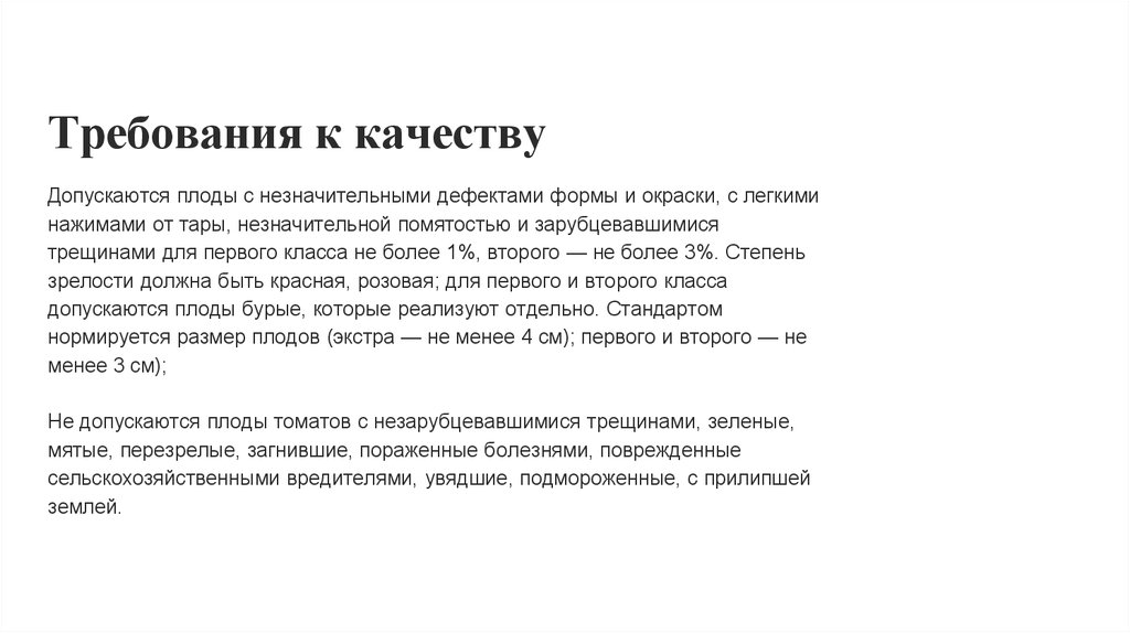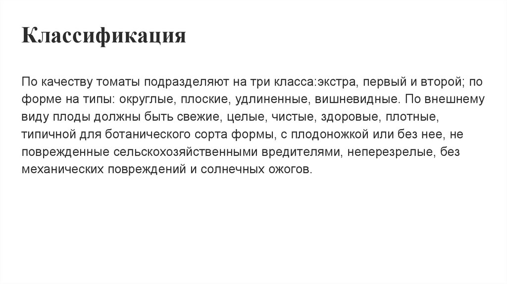 КлассификацияПо качеству томаты подразделяют на три класса:экстра, первый и второй; по