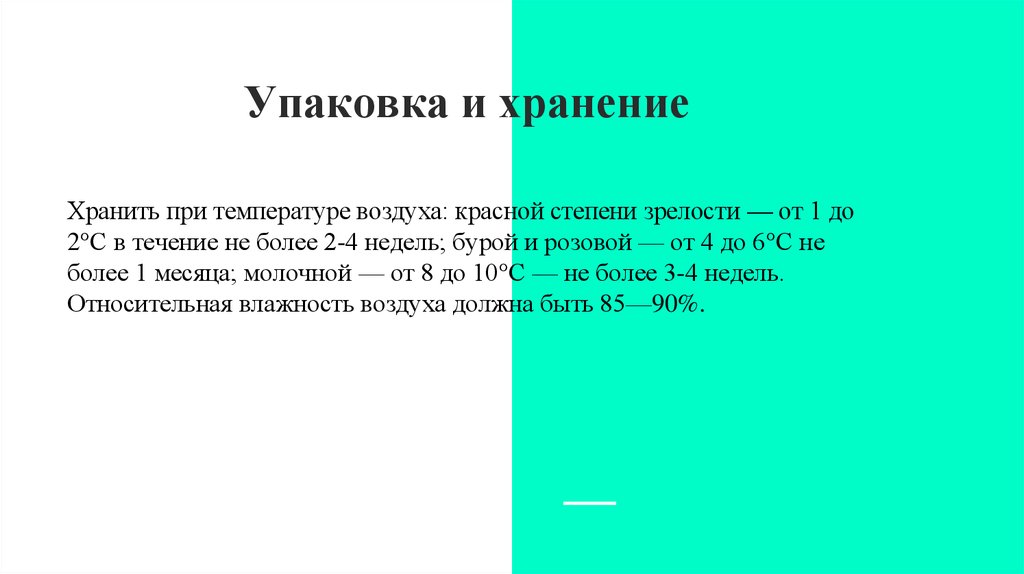 Упаковка и хранениеХранить при температуре воздуха: красной степени зрелости — от 1 до