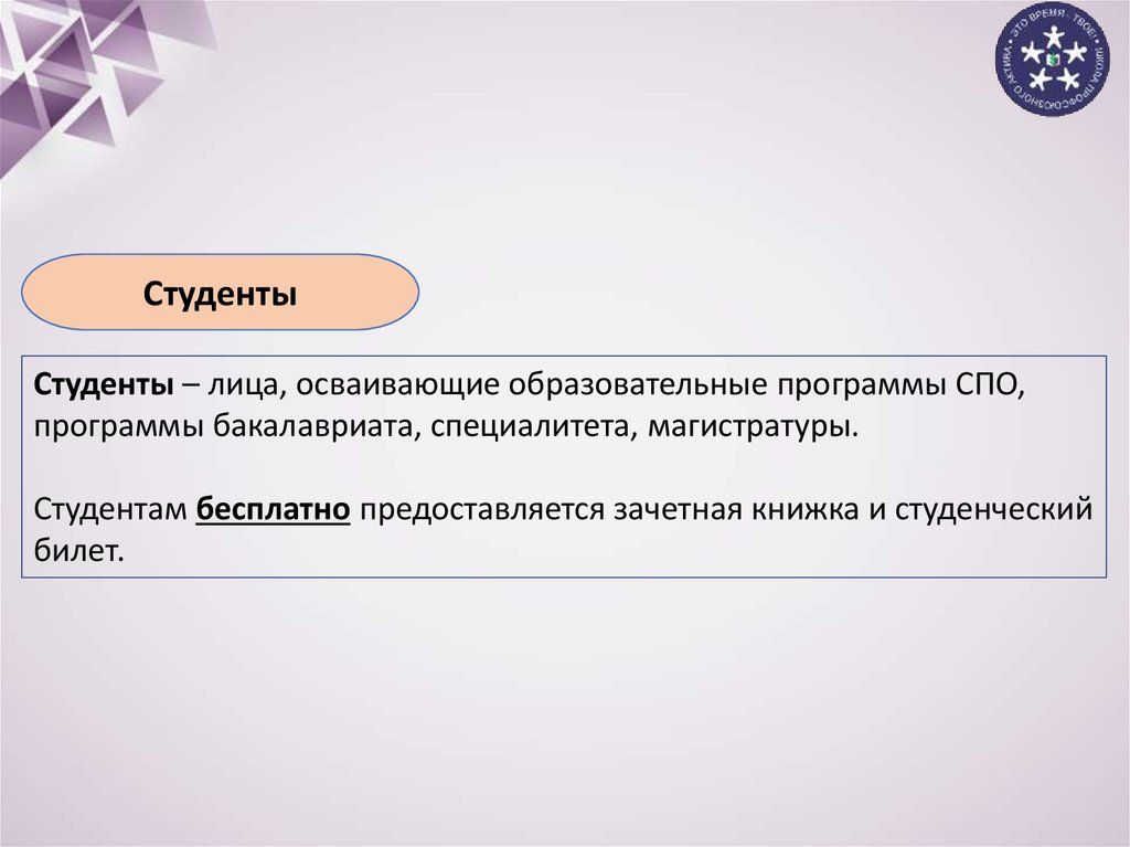 СтудентыСтуденты – лица, осваивающие образовательные программы СПО,