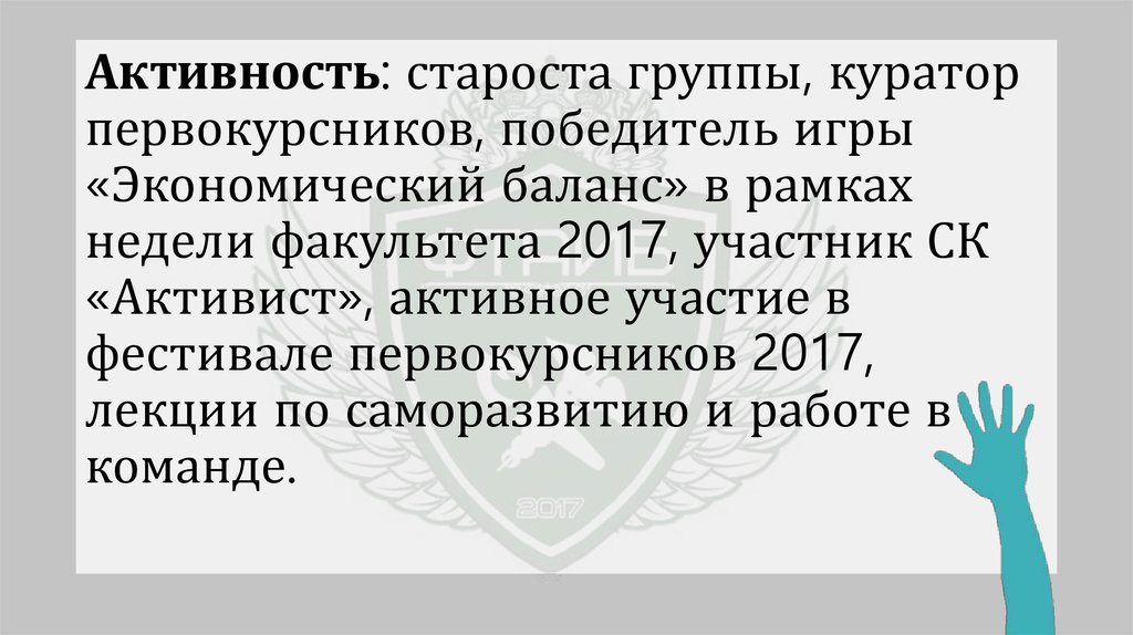 Активность: староста группы, кураторпервокурсников, победитель игры