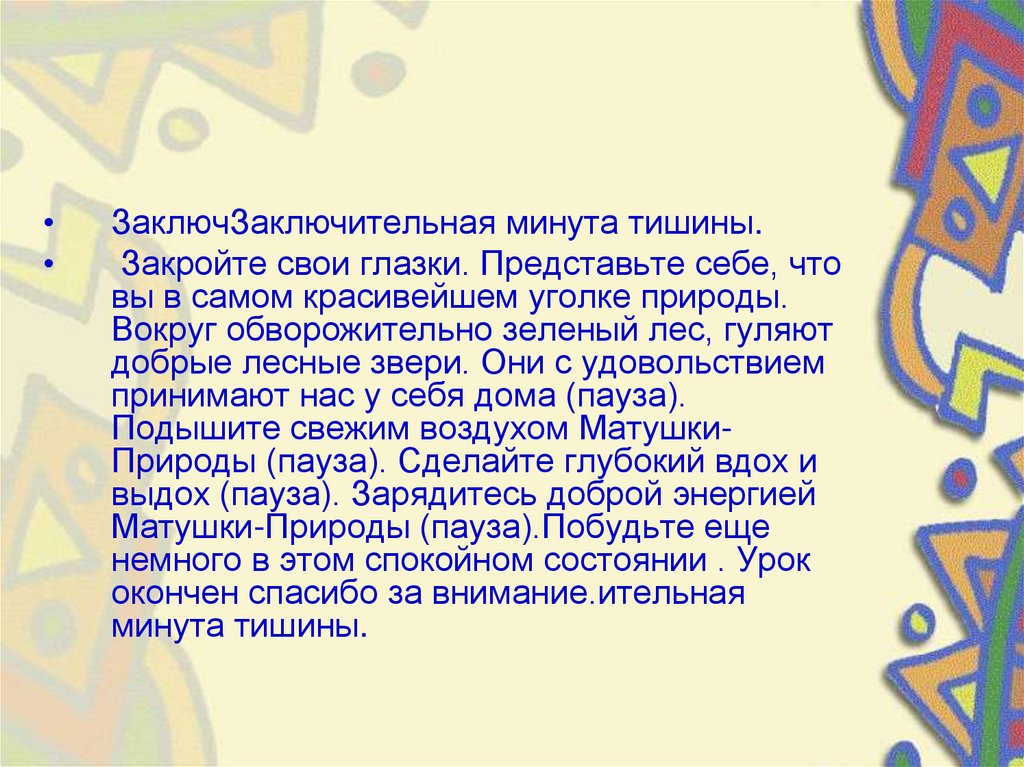 Подышите свежим воздухом МатушкиПрироды (пауза). Сделайте глубокий вдох и