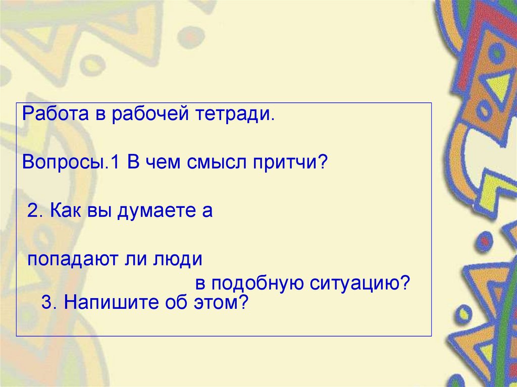 Работа в рабочей тетради.Вопросы.1 В чем смысл притчи?