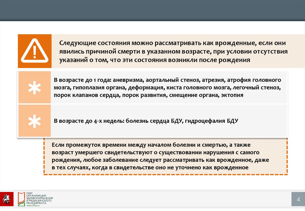 Следующие состояния можно рассматривать как врожденные, если ониявились причиной смерти в указанном возрасте, при условии отсутствия