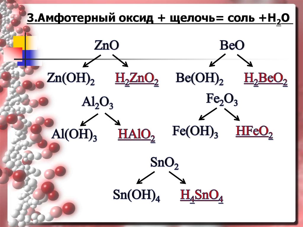 3.Амфотерный оксид + щелочь= соль +Н2О3.