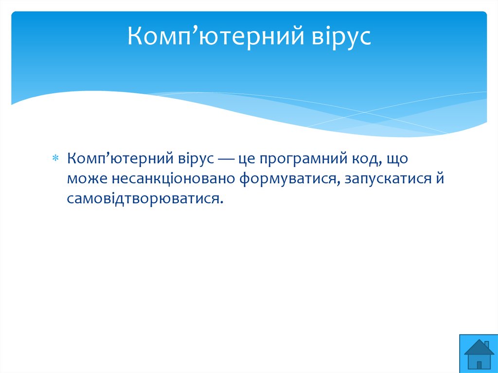Комп’ютерний вiрус — це програмний код, щоможе несанкцiоновано формуватися, запускатися й