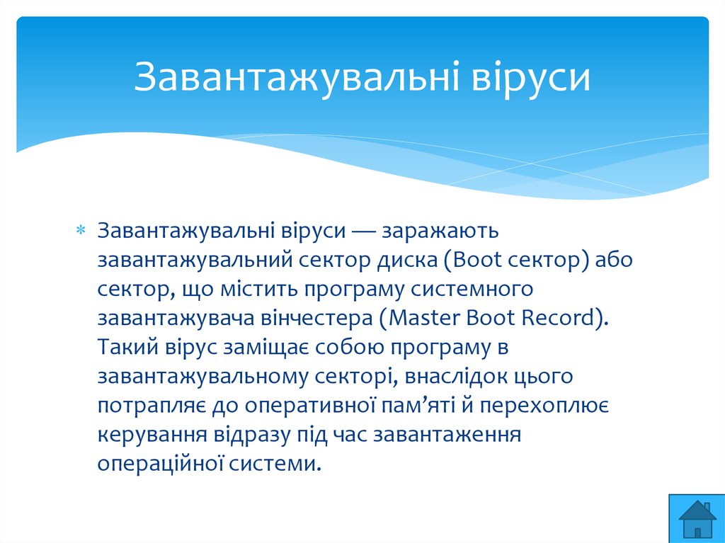 Завантажувальнi вiруси — заражаютьзавантажувальний сектор диска (Boot сектор) або