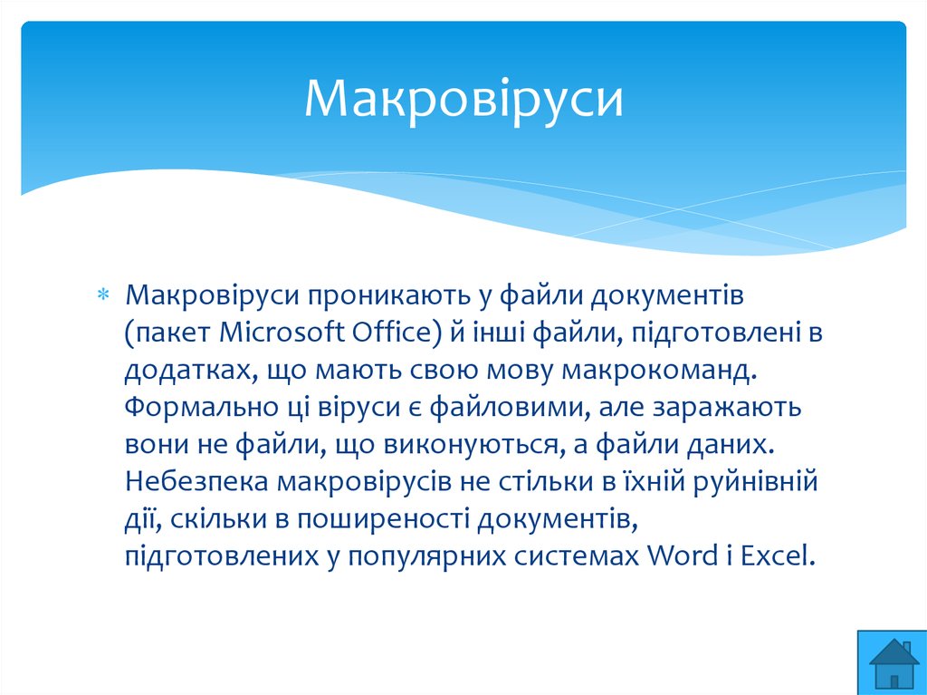 Макровiруси проникають у файли документiв(пакет Microsoft Office) й iншi файли, пiдготовленi в