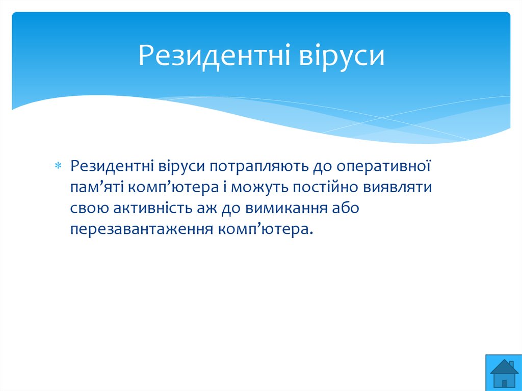 Резидентнi вiруси потрапляють до оперативноїпам’ятi комп’ютера i можуть постiйно виявляти