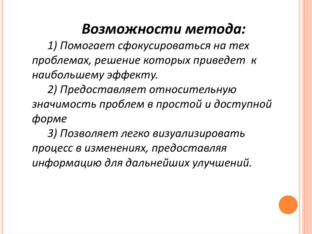 Возможности метода:1) Помогает сфокусироваться на тех