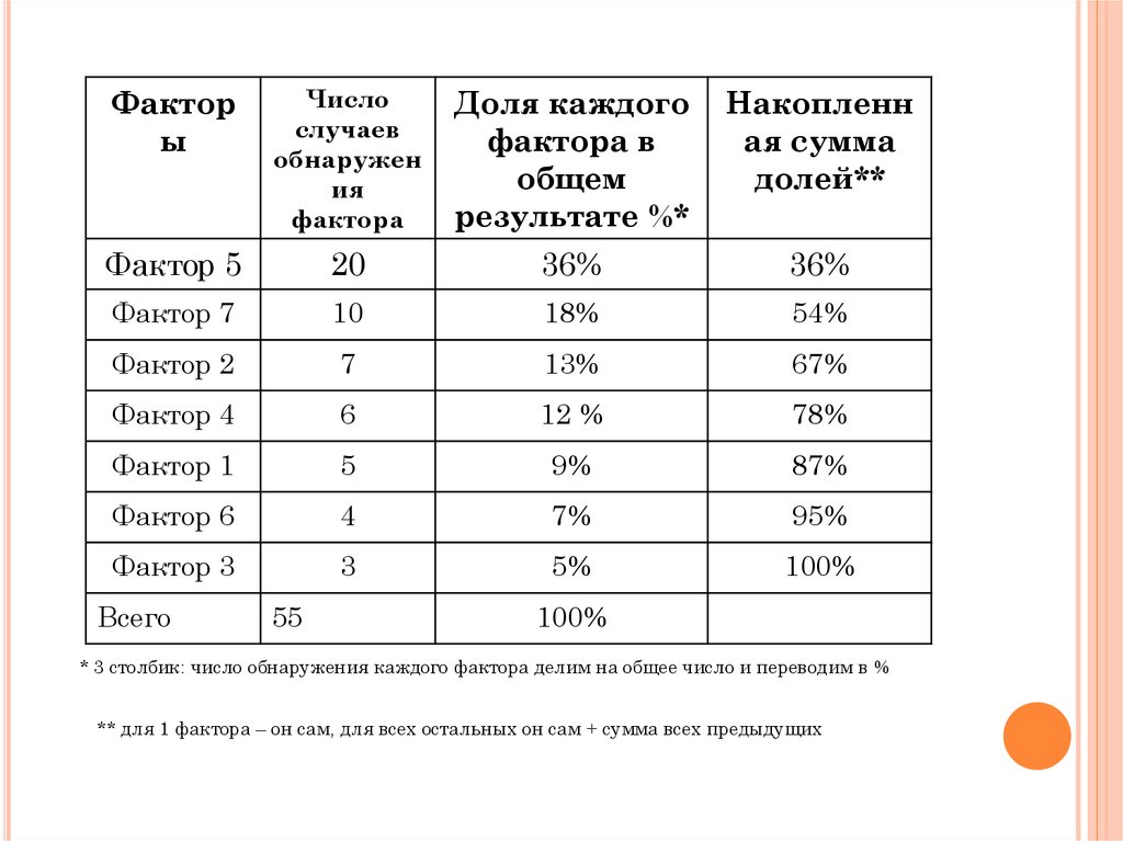 * 3 столбик: число обнаружения каждого фактора делим на общее число и переводим в %