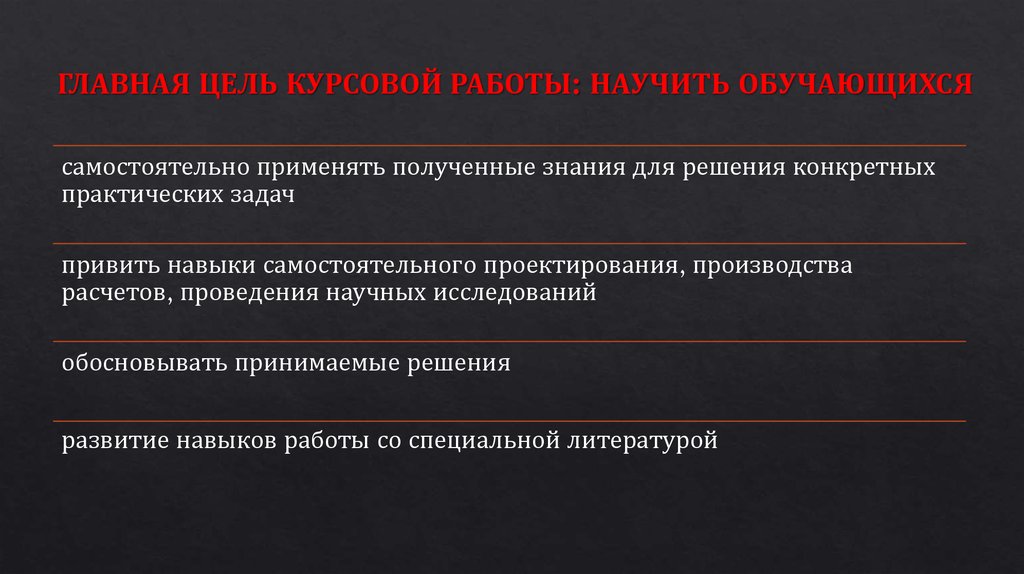 ГЛАВНАЯ ЦЕЛЬ КУРСОВОЙ РАБОТЫ: НАУЧИТЬ ОБУЧАЮЩИХСЯсамостоятельно применять полученные знания для решения конкретных