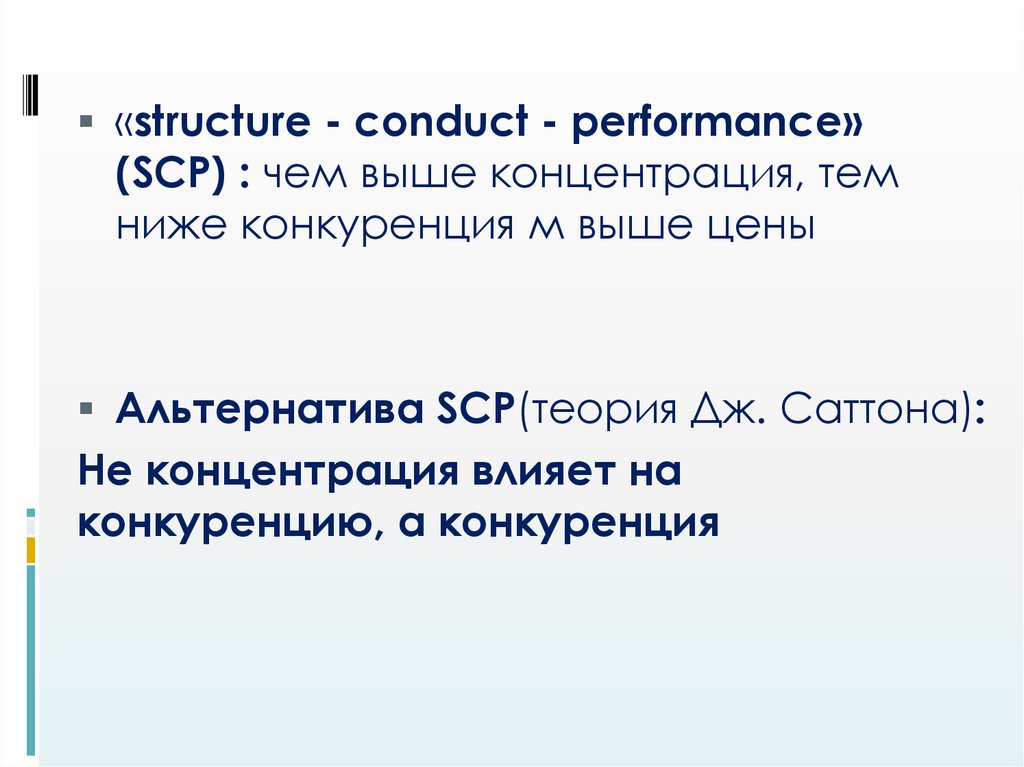 «structure - conduct - performance»(SCP) : чем выше концентрация, тем