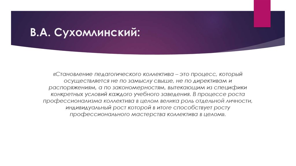 В.А. Сухомлинский:«Становление педагогического коллектива – это процесс, который