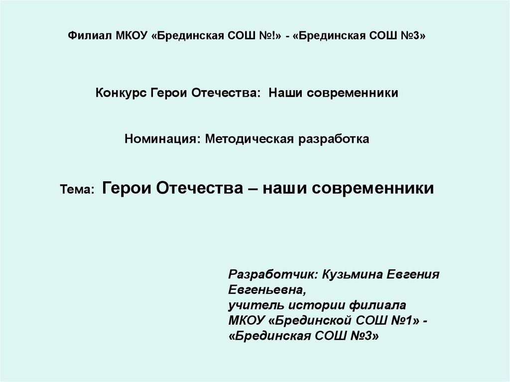 Филиал МКОУ «Брединская СОШ №!» - «Брединская СОШ №3»Конкурс Герои Отечества: Наши современники