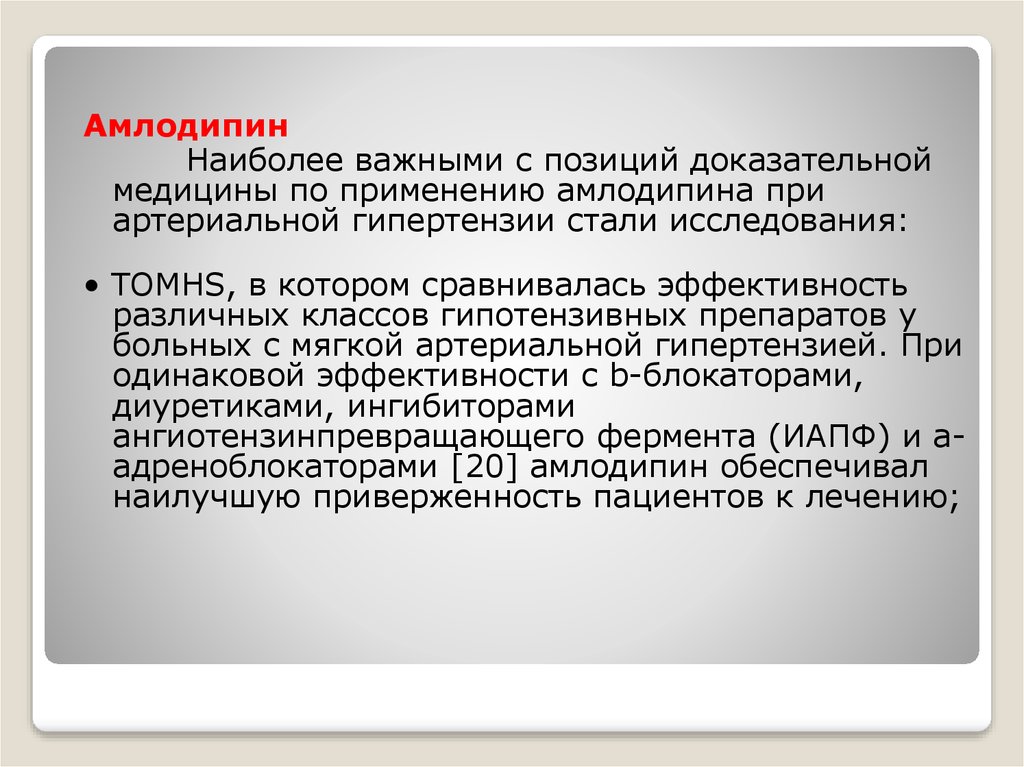 • ALLHAT, которое убедительно продемонстрировалоэффективность и безопасность амлодипина у пациентов