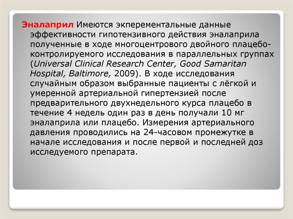 Эналаприл Имеются экперементальные данныеэффективности гипотензивного действия эналаприла