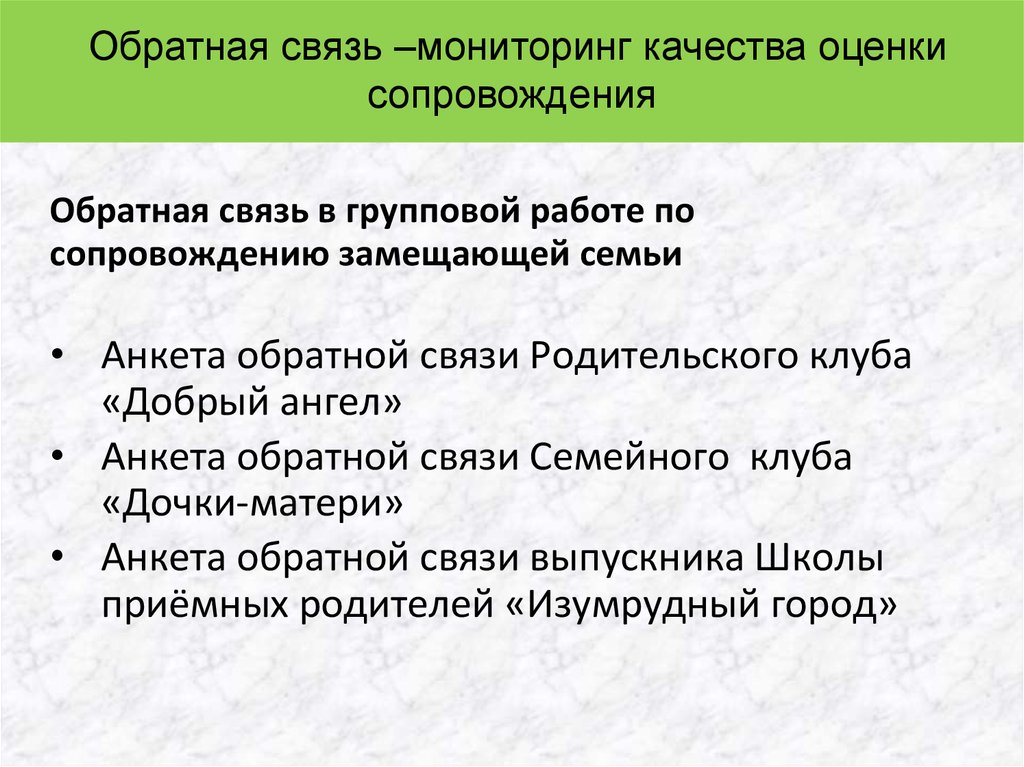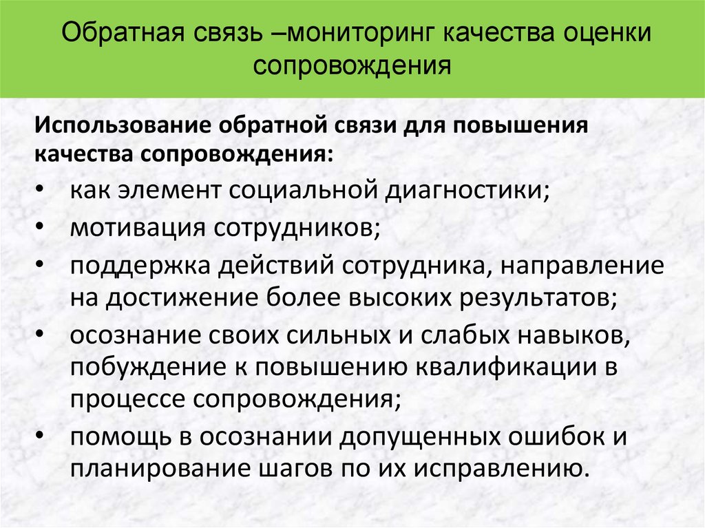 Обратная связь –мониторинг качества оценкисопровождения