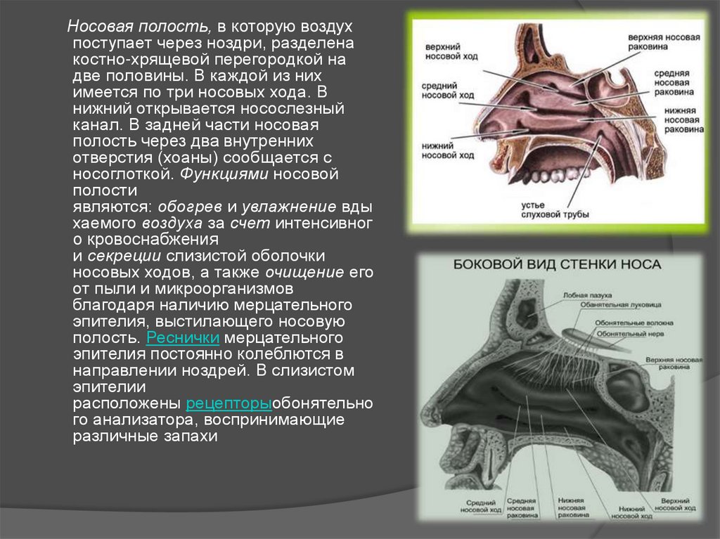 Носовая полость, в которую воздухпоступает через ноздри, разделена
