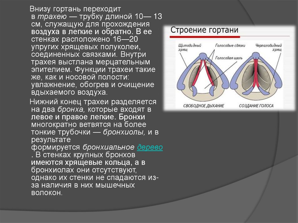 Внизу гортань переходитв трахею — трубку длиной 10— 13