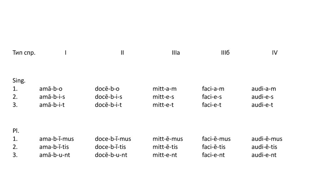 • I и II спряжение – суффикс –b- к основе инфекта, тематические гласные