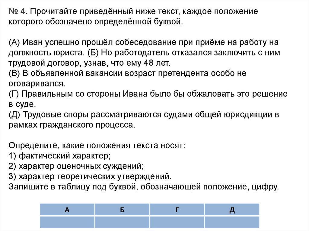 № 4. Прочитайте приведённый ниже текст, каждое положениекоторого обозначено определённой буквой.