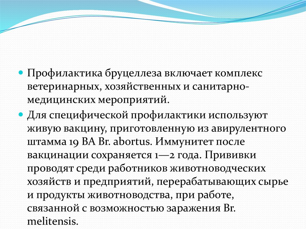 Профилактика бруцеллеза включает комплексветеринарных, хозяйственных и санитарномедицинских мероприятий.