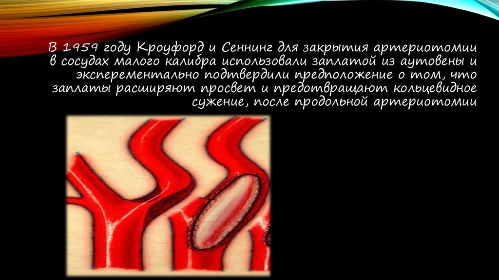 В 1959 году Кроуфорд и Сеннинг для закрытия артериотомиив сосудах малого калибра использовали заплатой из аутовены и