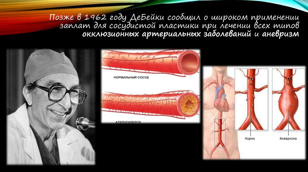 Позже в 1962 году ДеБейки сообщил о широком применениизаплат для сосудистой пластики при лечении всех типов