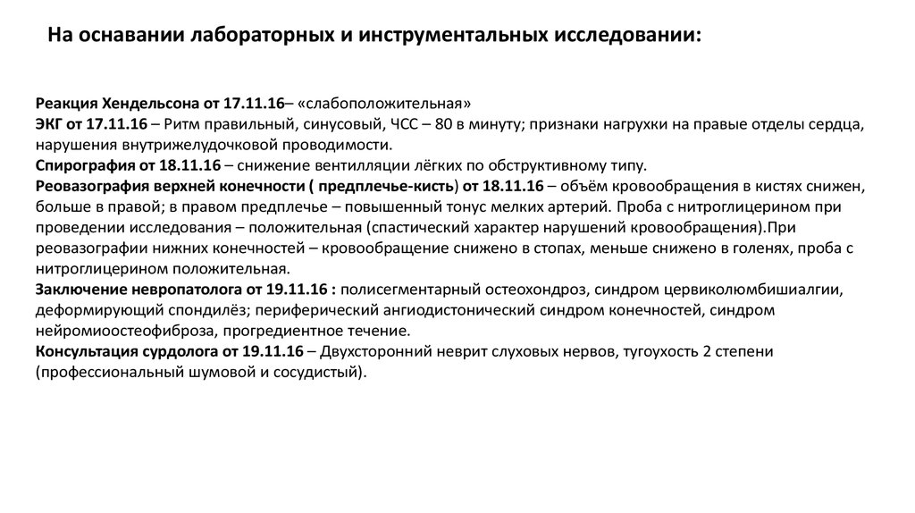 На оснавании лабораторных и инструментальных исследовании:Реакция Хендельсона от 17.11.16– «слабоположительная»