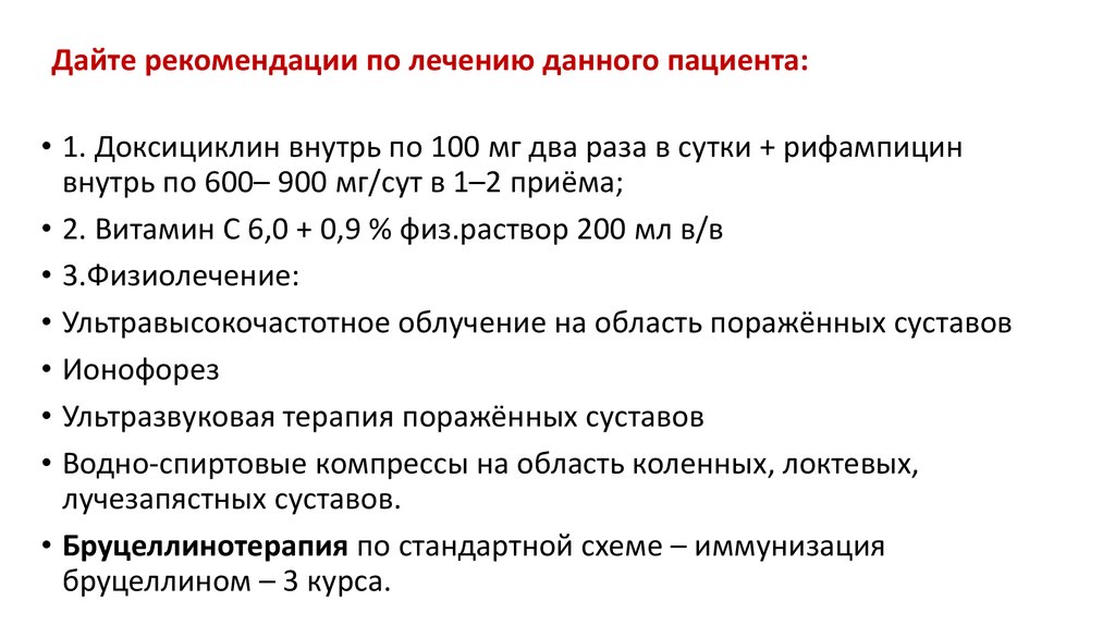 Дайте рекомендации по лечению данного пациента:• 1. Доксициклин внутрь по 100 мг два раза в сутки + рифампицин