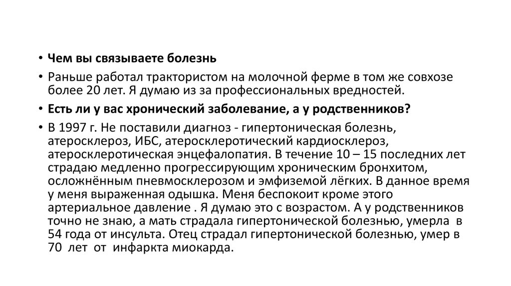 • Чем вы связываете болезнь• Раньше работал трактористом на молочной ферме в том же совхозе