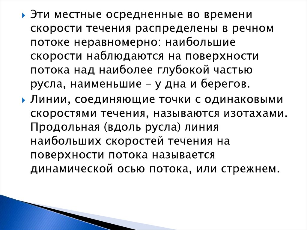 Для рек характерен турбулентный режим движенияводы, и скорость течения в любой точке речного