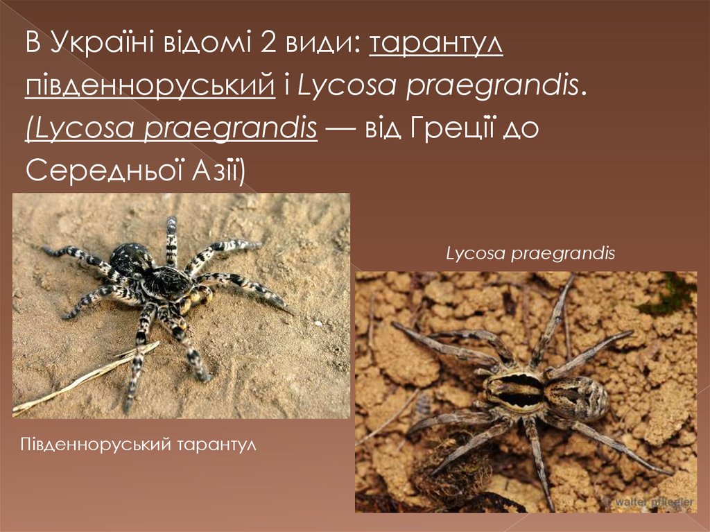 В Україні відомі 2 види: тарантулпівденноруський і Lycosa praegrandis.