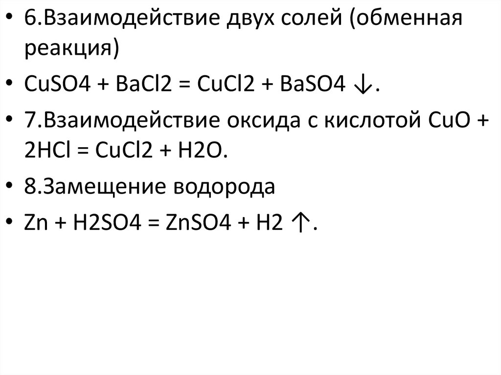 • CuSO4 + BaCl2 = CuCl2 + BaSO4 ↓.