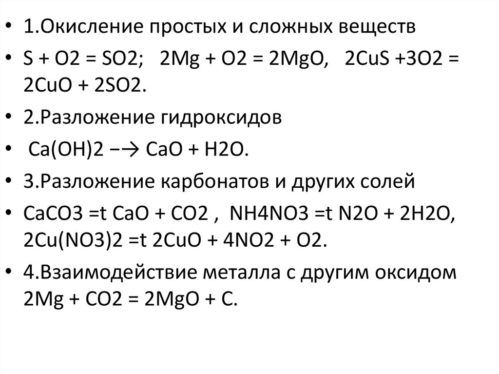 • 1.Окисление простых и сложных веществ• S + O2 = SO2; 2Mg + O2 = 2MgO, 2CuS +3O2 =