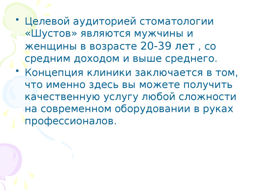 • Целевой аудиторией стоматологии«Шустов» являются мужчины и