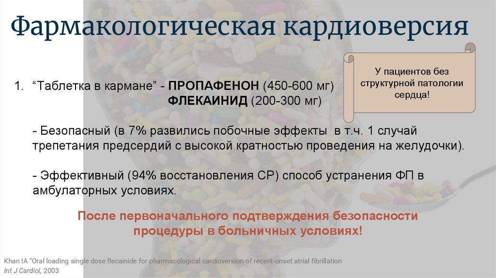 Фармакологическая кардиоверсия1. “Таблетка в кармане” - ПРОПАФЕНОН (450-600 мг)