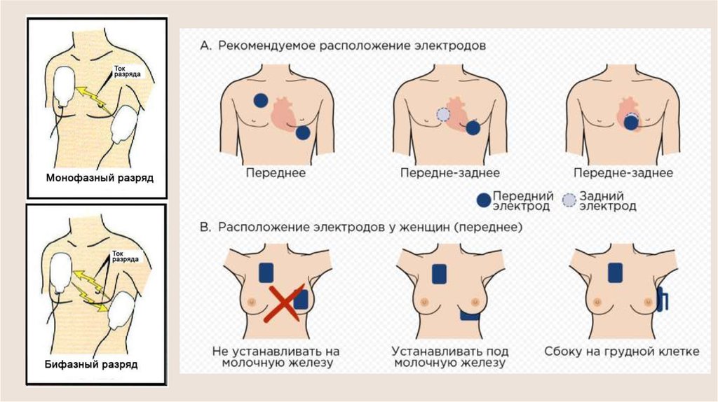 ЭКВ при наличии кардиовертердефибриллятора➔ Электрод на расстоянии 6-8 см от места