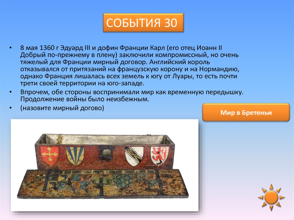 СОБЫТИЯ 308 мая 1360 г Эдуард III и дофин Франции Карл (его отец Иоанн II