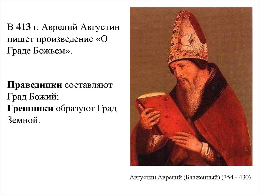 В 413 г. Аврелий Августинпишет произведение «О