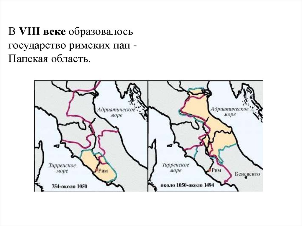 В VIII веке образовалосьгосударство римских пап Папская область.