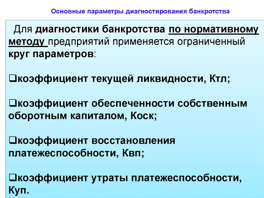 Основные параметры диагностирования банкротстваДля диагностики банкротства по нормативному