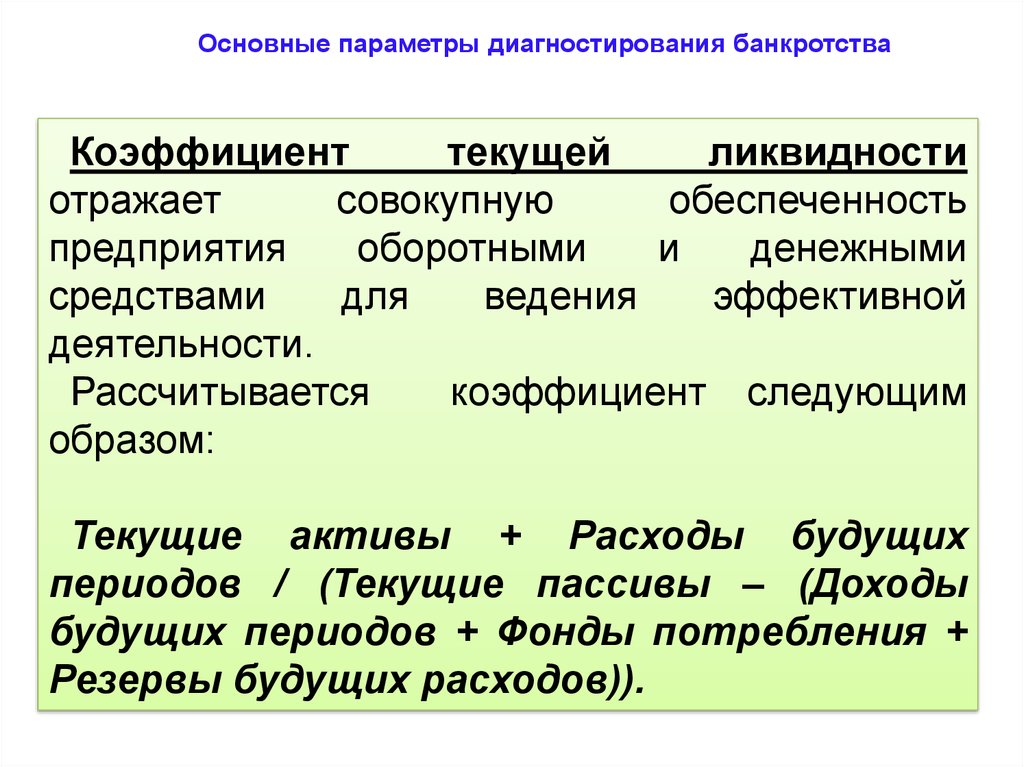 Основные параметры диагностирования банкротстваВ ситуации, если коэффициент текущей ликвидности и доля