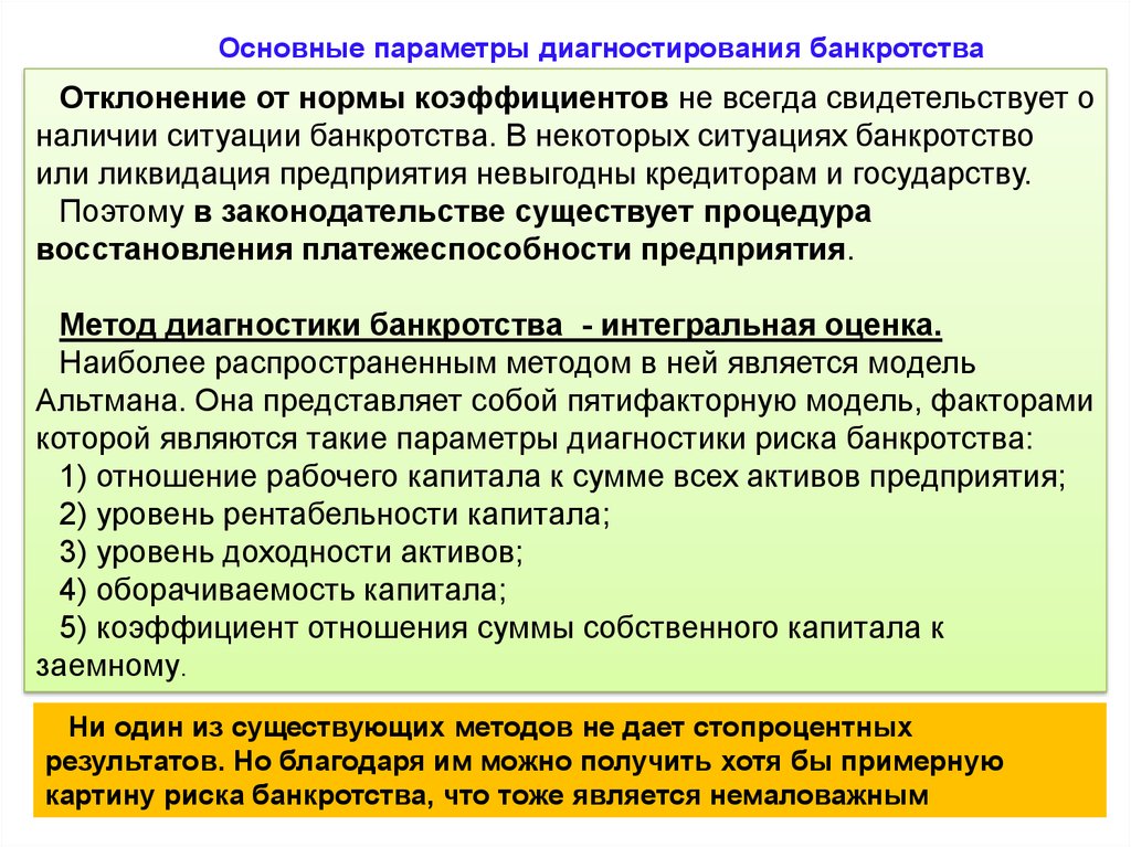 Основные параметры диагностирования банкротстваОтклонение от нормы коэффициентов не всегда свидетельствует о