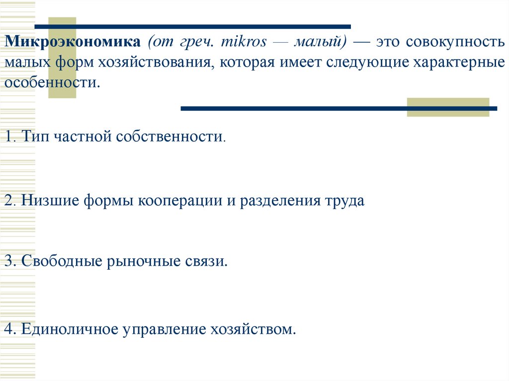 Микроэкономика (от греч. mikros — малый) — это совокупностьмалых форм хозяйствования, которая имеет следующие характерные