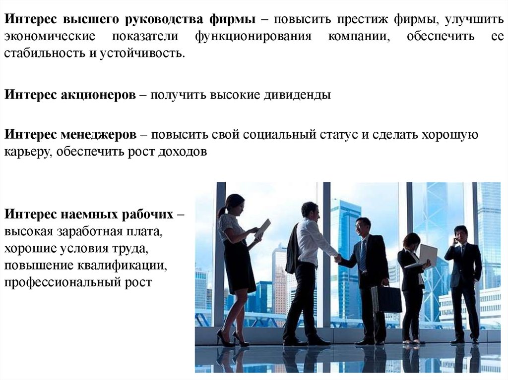 Интерес высшего руководства фирмы – повысить престиж фирмы, улучшитьэкономические показатели функционирования компании, обеспечить ее
